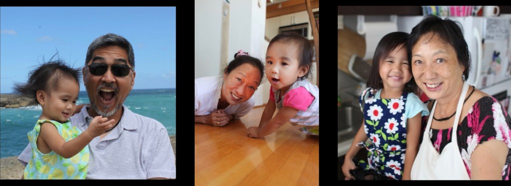 From left: three generations of Kiyohara men making funny faces; playing with grandson on Kaimana Beach; the three of us wearing funny hats at a wedding in Honolulu.