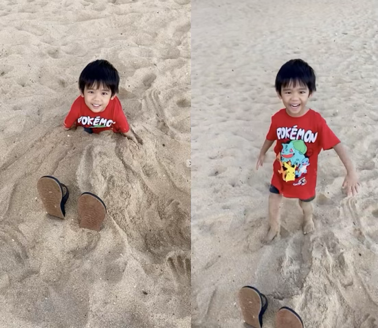 I know—I’ll write about Nembutsu as repeated experience of “I get it!” immediately followed by “I don’t get it!” in this month’s newsletter. So I turn on my computer and up pops this photo of our five-year-old grandson taking delight in “fooling” people with the old schtick “bury your legs in the sand, use grandpa’s slippers to make your legs look really long, then stand up!”